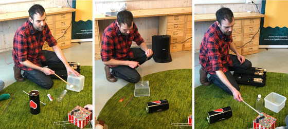 Tills nästa gång de ses fick klassen i uppdrag att leta i skolan och hemma efter saker som ändå skulle slängas och kan ha ett ljud. "–Lyssna, slå på det, skaka och fundera på hur det kan komma ut olika ljud."