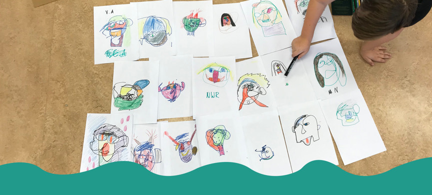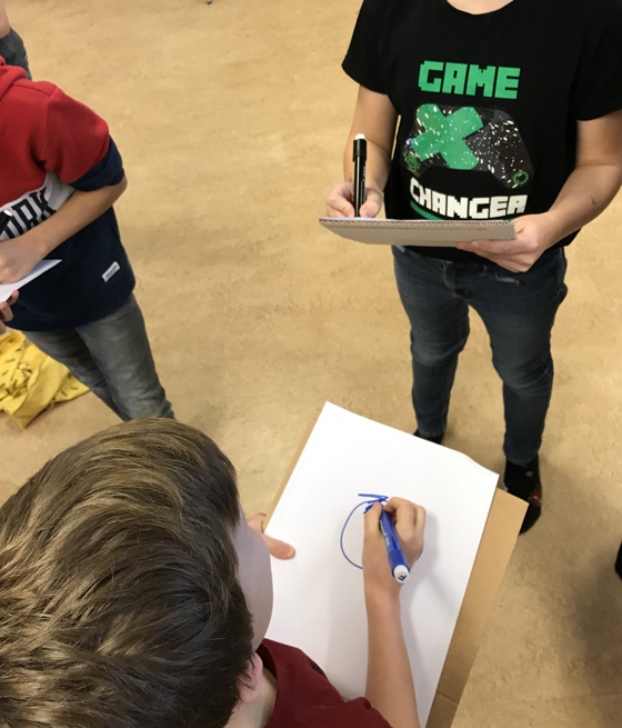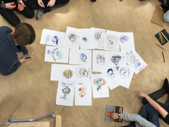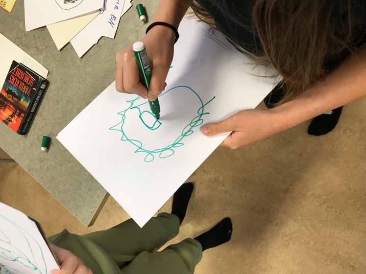 Sen var det dags för workshop! Klassen delades i två och ena halvan fick skapa ett gemensamt grupp-foto genom att göra snabbporträtt av varandra. Reglerna är enkla* men kluriga och ledde till många skratt när resultaten visades upp. (*Pennan får inte lyfta pappret och man får inte titta på pappret medan man ritar).