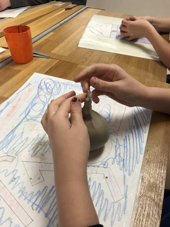 Hos Ulrika fick eleverna testa att skapa med lera. De fick pröva på att göra ett kretslopp i naturen med en och samma lerklump i olika former. Först gjorde de runda bollar som frön. Sedan började något gro ur fröet som sedan växte allt mer för att slutligen förfalla.