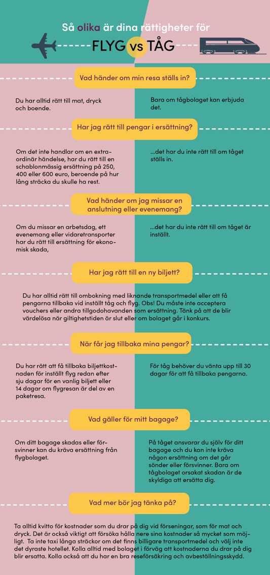 Om flyget ställs in, och det inte handlar om en extraordinär händelse, har du rätt till en schablonmässig ersättning på 250, 400 eller 600 euro, beroende på hur lång sträcka du skulle ha rest. Det har du inte rätt till om tåget ställs in.