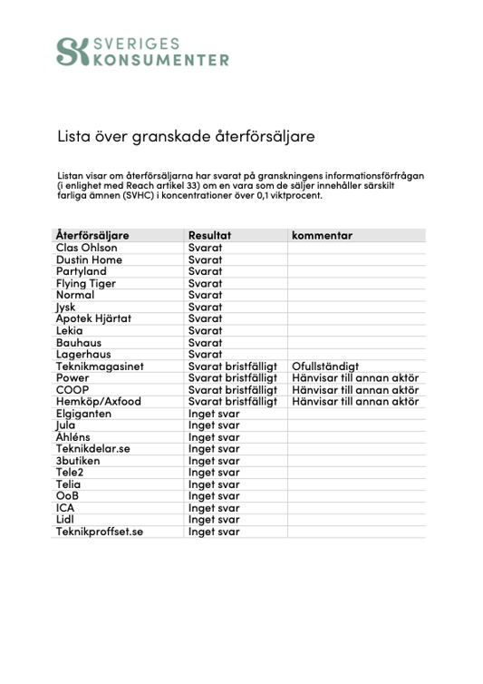 • 10 av 25 återförsäljare svarade på frågan om varans kemikalieinnehåll.