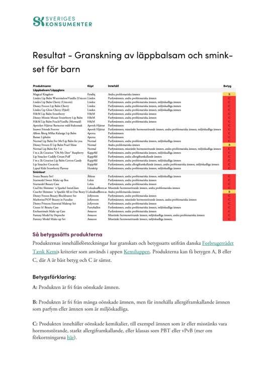 Hela 29 av 32 granskade produkter får sämsta betyget C. Ingen av produkterna som vi köpt i Sverige klassas som A och endast två läppbalsam och ett smink-set får medelbetyget B.
