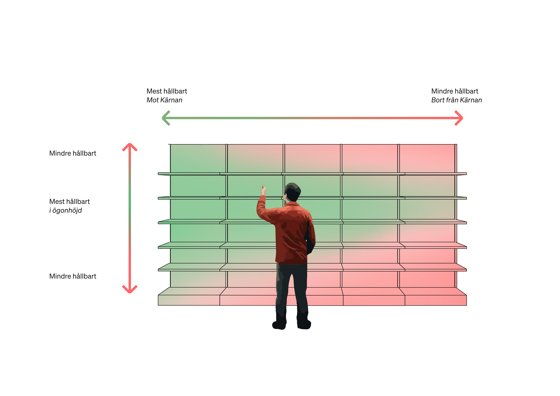 Även i gångarna görs en avvägning av vad som är mest hållbart och hälsosamt. De mer hållbara och hälsosamma alternativen placeras i ögonhöjd så nära kärnan som möjligt, medan andra varor placeras högt/lågt och längre in i gångarna.