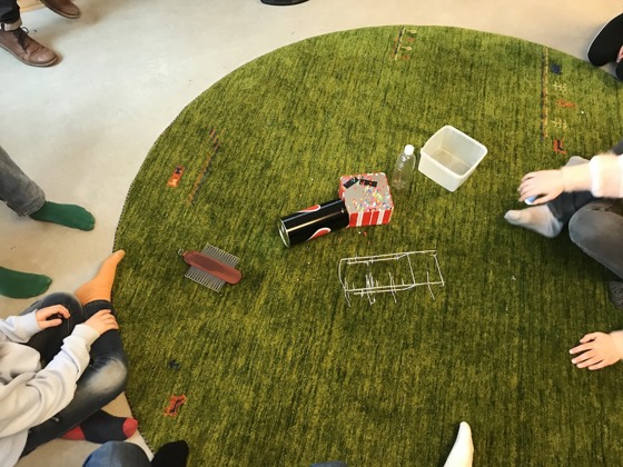 Tills nästa gång de ses fick klassen i uppdrag att leta i skolan och hemma efter saker som ändå skulle slängas och kan ha ett ljud. "–Lyssna, slå på det, skaka och fundera på hur det kan komma ut olika ljud."