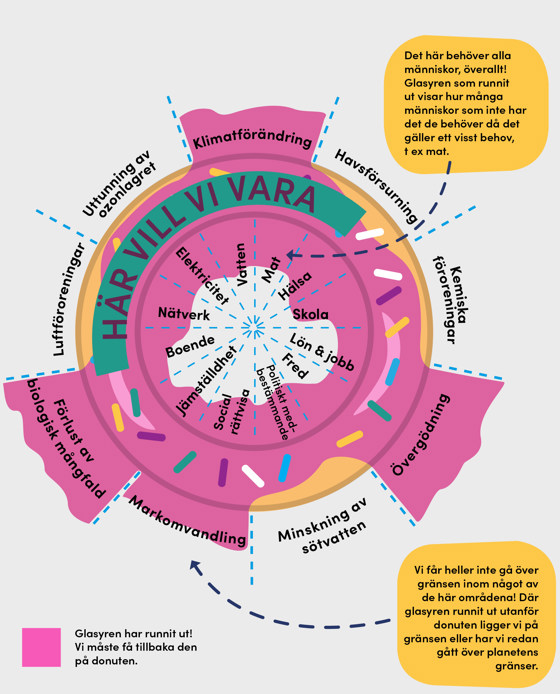 Minns du planetens nio gränser från elevmagasinet? Och att områdena inne i donuten är det som krävs för att vi människor ska trivas och må bra på planeten Jorden: våra behov och rättigheter.