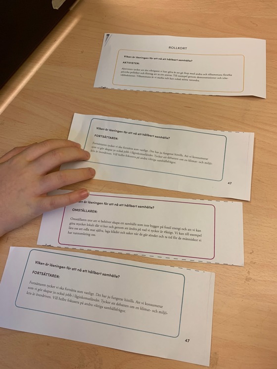 Alla fick en roll. Rollerna hette Fortsättaren, Omställaren, Aktivisten och Teknikutvecklaren. Vi hjälptes åt att läsa på vad varje roll tyckte och tänkte om ett hållbart samhälle.
