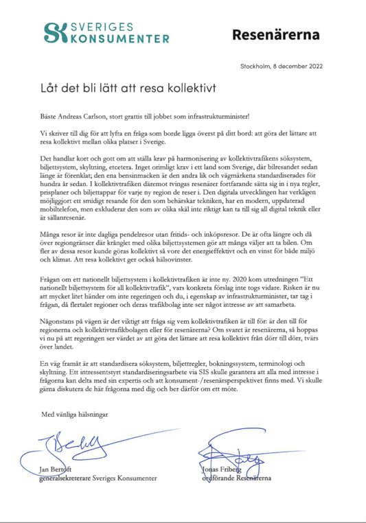 Frågan om ett nationellt biljettsystem i kollektivtrafiken är inte ny. 2020 kom utredningen ”Ett nationellt biljettsystem för all kollektivtrafik”, vars konkreta förslag inte togs vidare. Risken är nu att mycket litet händer om inte regeringen och du, i egenskap av infrastrukturminister, tar tag i frågan, då flertalet regioner och deras trafikbolag inte ser något intresse av att samarbeta.
