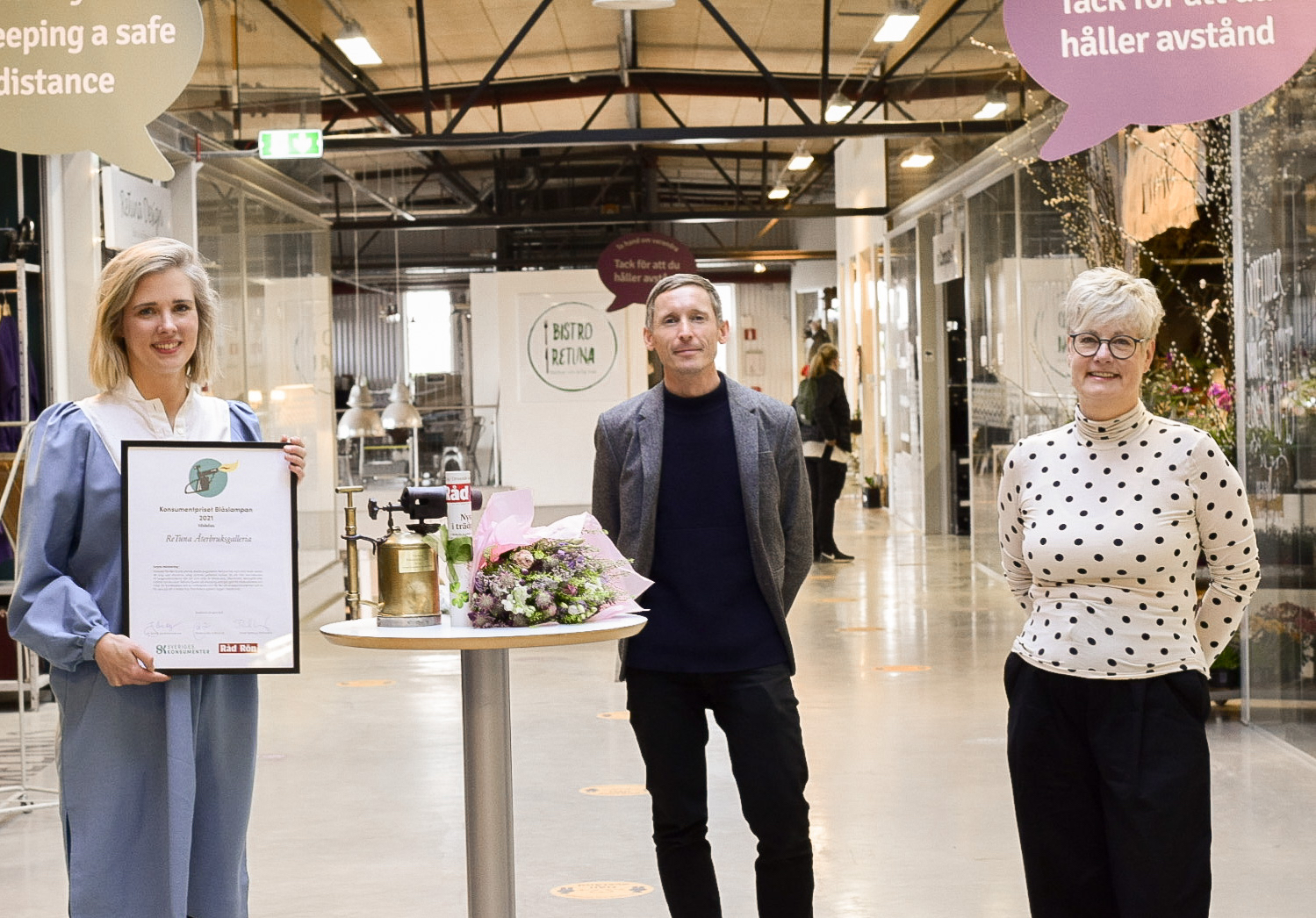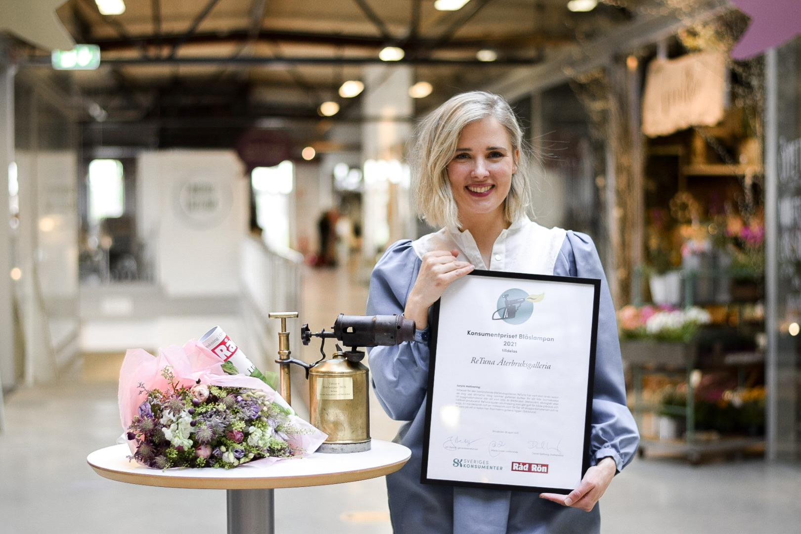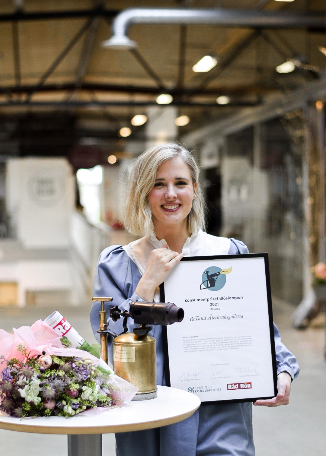 Priset, en antik blåslampa, 10 000 kronor och en prenumeration på tidningen Råd & Rön, överlämnas till ReTunas centrumledare Sofia Bystedt vid en ceremoni i ReTuna återbruksgalleria, Folkestaleden 7 i Eskilstuna kl 11 idag, onsdag 28 april.