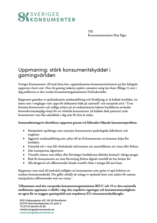 Tillsammans med 19 andra europeiska konsumentorganisationer kräver Sveriges Konsumenter förbättringar av konsumentskyddet för europeiska gamers, särskilt för barn. Bakgrunden är en ny rapport där den norska konsumentorganisationen Forbrukerrådet har granskat spelindustrins oschyssta affärsmetoder.
