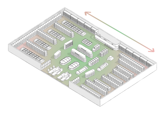 Skillnaden mellan gångarna och kärnan ska vara påtaglig. Här är formspråket stramare och hyllorna högre. Skillnaden kan också understrykas med hjälp av ljussättning.