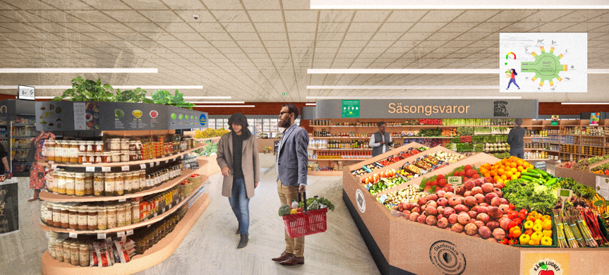 Kunden kommer rakt in i butikens kärna där de hälsosamma och hållbara alternativen finns samlade i en miljö som ska vara såväl aptitretande som inspirerande. På bilden är kärnan grönfärgad medan det längre ut i gångarna blir allt mer rött – det vill säga att ju längre ut i gångarna man rör sig desto mer ohållbara och ohälsosamma är produkterna. Förhoppningen är att få kunderna att göra det korta kundvarvet i kärnan.